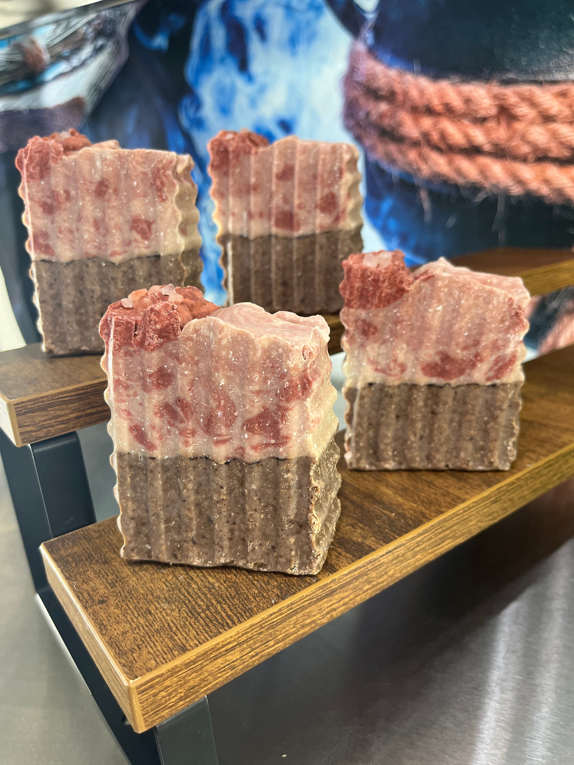 Peppermint Patti is a light exfoliating soap. The peppermint is an essential oil. Originally made specifically as a foot soap but it’s light enough to use as a body soap. Pink Himalayan Salt adds a light exfoliation. The cocoa powder blends well with the peppermint.